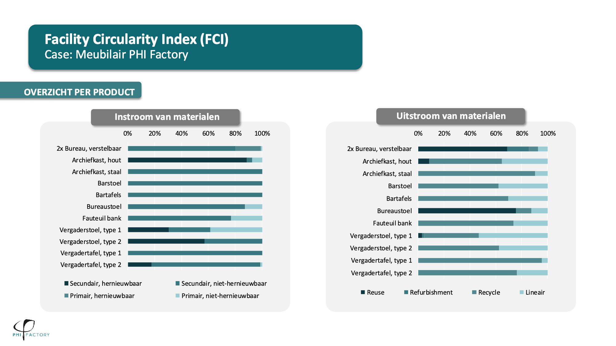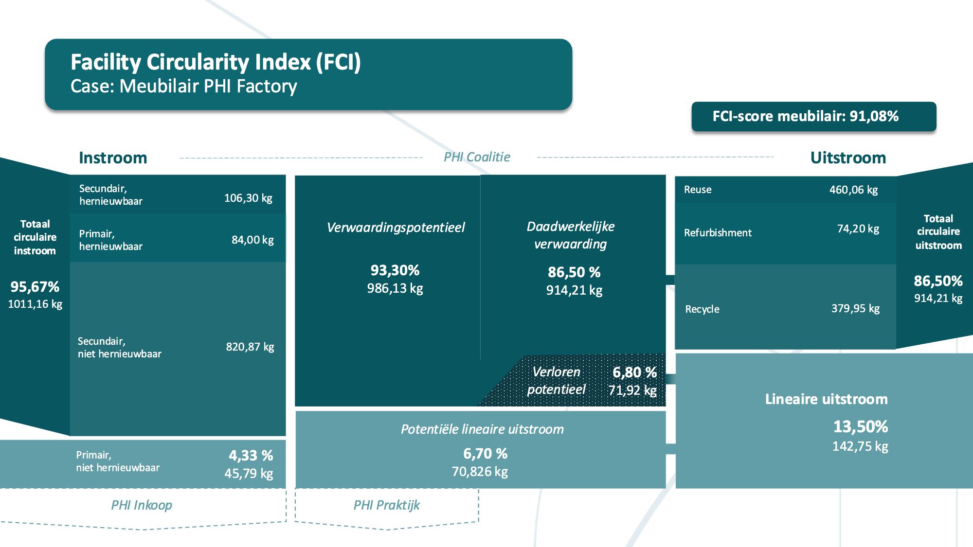 De analyse met de Facility Circularity Index (FCI) laat zien dat het meubilair van PHI Factory met een score van 91,08% circulariteit al op een hoog niveau presteert. Dit resultaat bevestigt dat bewuste keuzes in ontwerp, inkoop en contractbeheer direct bijdragen aan een meer circulaire inrichting. Toch is er ook voor PHI Factory nog verdere winst te behalen. Dit toon toont de FCIaan: voornamelijk bij de instroom van niet-hernieuwbare materialen zoals PU-schuim, verf en lijmen. En het vermijden van ontwerpen met slecht recyclebare materialen zoals MDF en overige kunststoffen die circulaire principes moeilijk toe te passen maken.