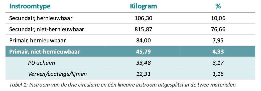 De massa van de-niet circulaire instroom bedraagt 45,79 kilogram. De niet-lineaire instroom komt voort uit met name het PU-schuim alsmede de verven/coating/lijmen die aangebracht zijn. Er zijn een aantal strategieën die passen bij het elimineren van de lineaire instroom.